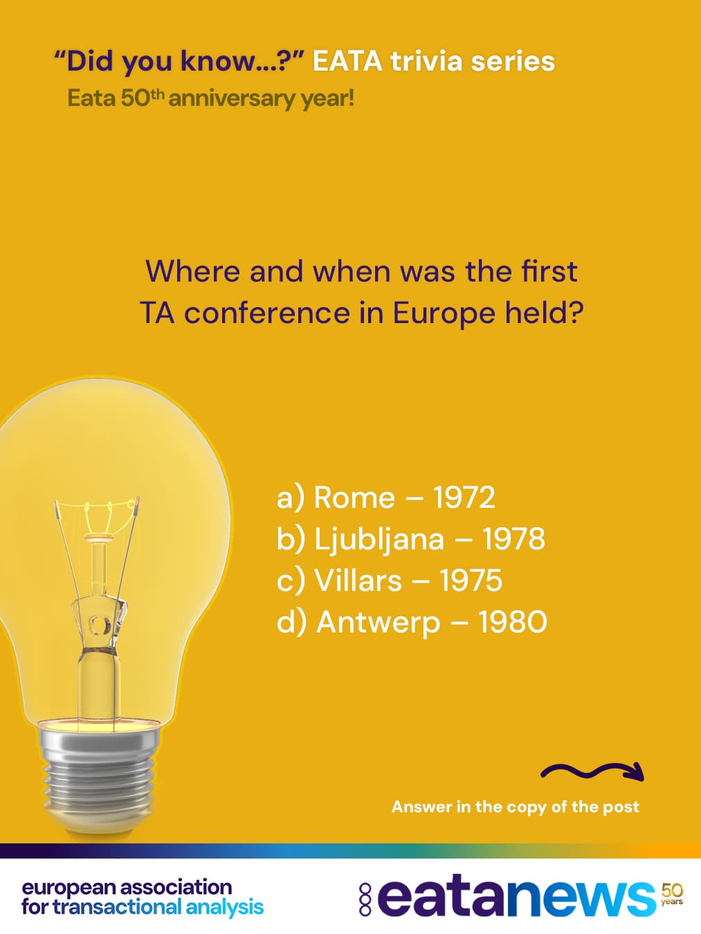 Each post brings you a new multiple-choice question to quiz your knowledge of Transactional Analysis in Europe and the history of EATA. Make your guess, then read on below to discover the correct answer and a bit of history behind it!
